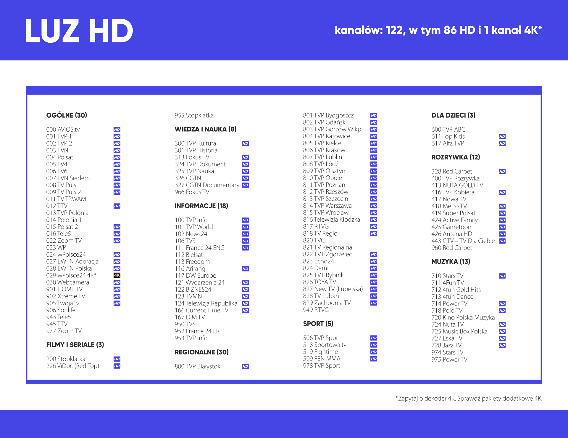 Ciesz się bogatą ofertą 122 kanałów telewizyjnych, z czego 86 w jakości HD. Dzięki połączeniu światłowodowemu oglądanie jest płynne i bez zakłóceń, a zmiana kanałów odbywa się natychmiast. To idealny pakiet dla osób, które chcą mieć szeroki wybór kanałów w wysokiej jakości dla całej rodziny. Dodatkowo możesz skorzystać z opcji nagrywania programów i filmów na życzenie, jeśli są dostępne w Twoim abonamencie.